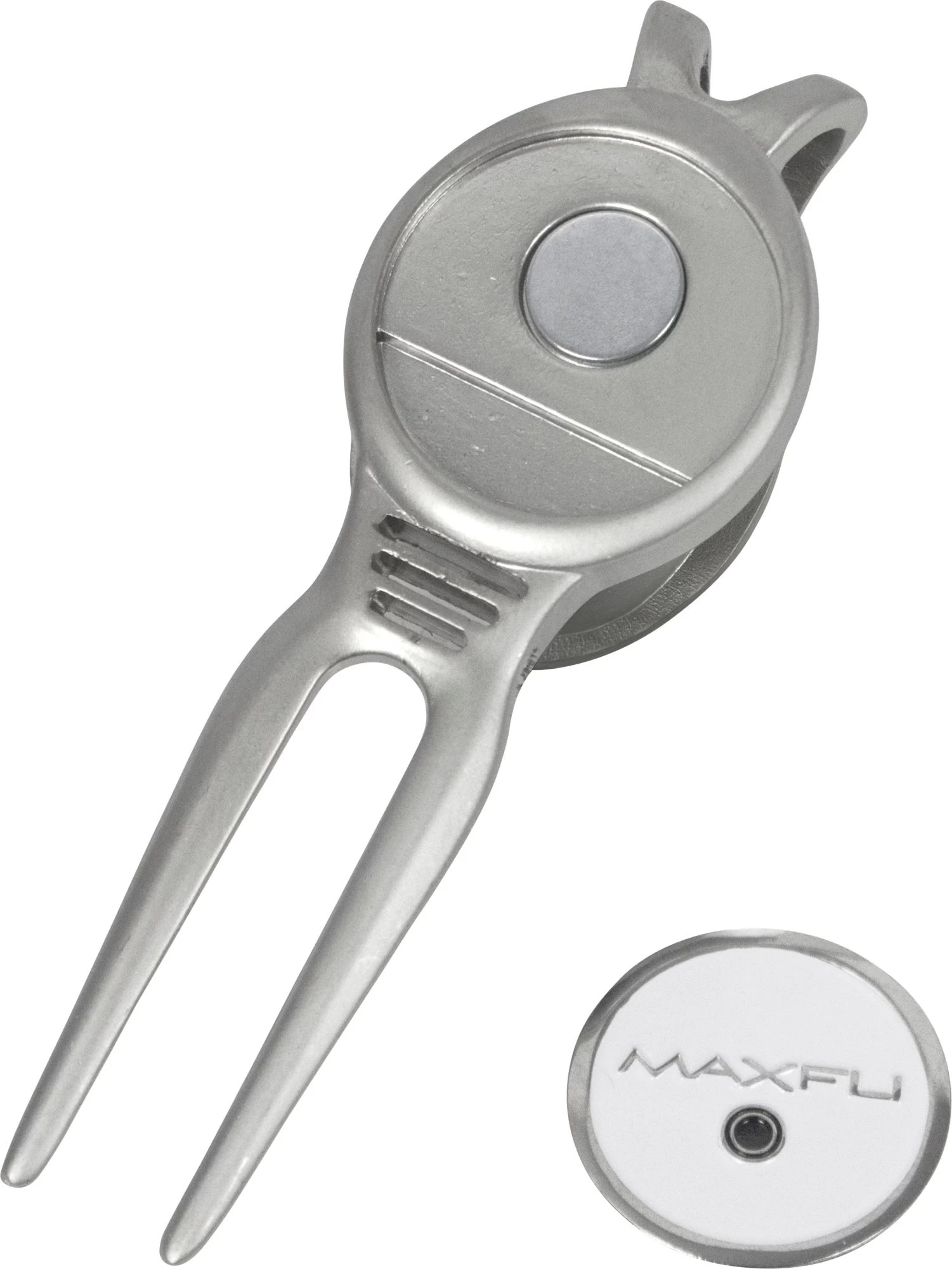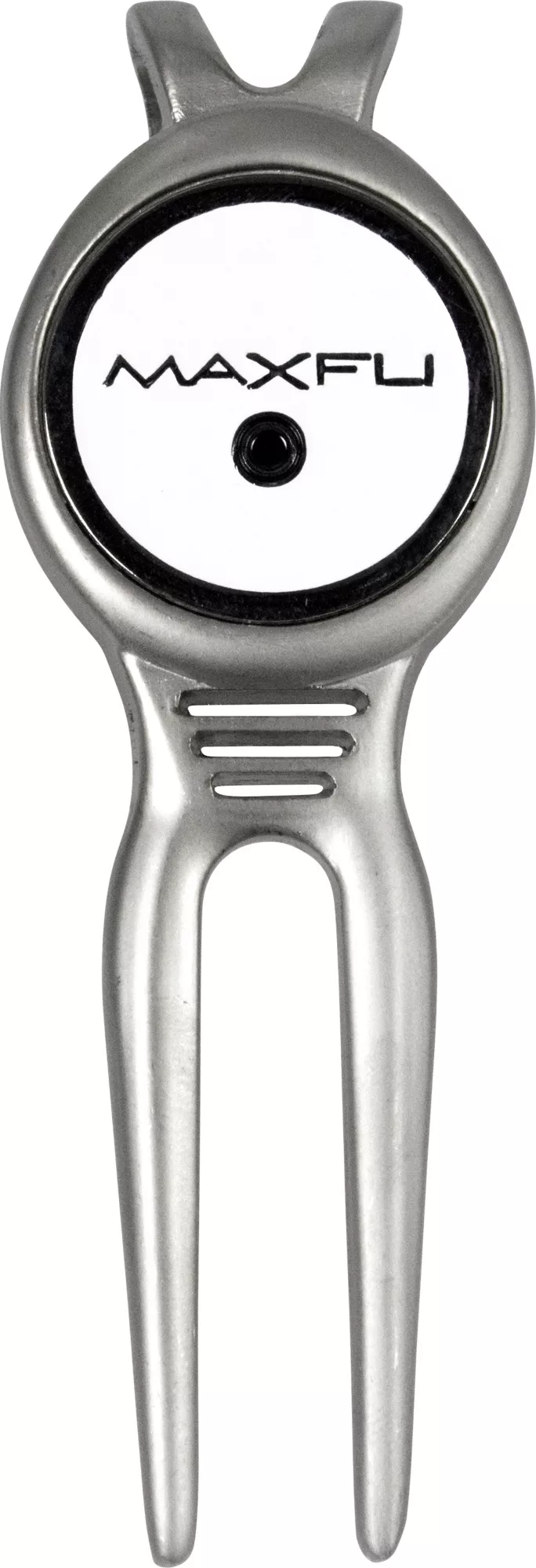 Repair ball marks after sticking the approach shot with the Maxfli® Deluxe Divot Tool. An oversized grip handle provides a comfortable grip as you replace your mark. A spring-loaded push button unfolds the prongs for fast and easy use when repairing a divot. After use, simply fold the prongs back inside the handle for safety during transportation. Leave your mark on the course without damaging the greens with the Maxfli® Deluxe Divot Tool