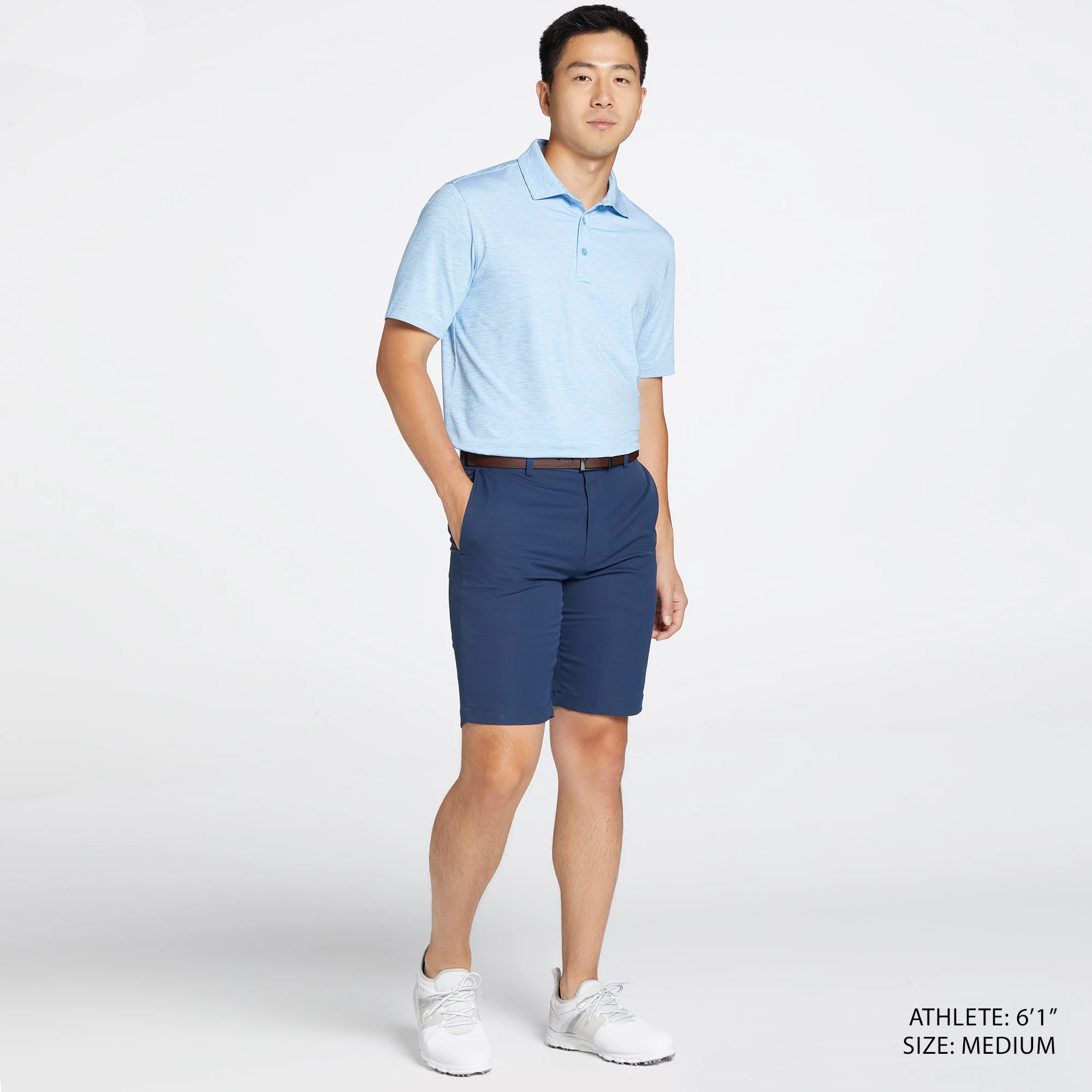 - 3-button placket and flat-knit collar for a course-ready look